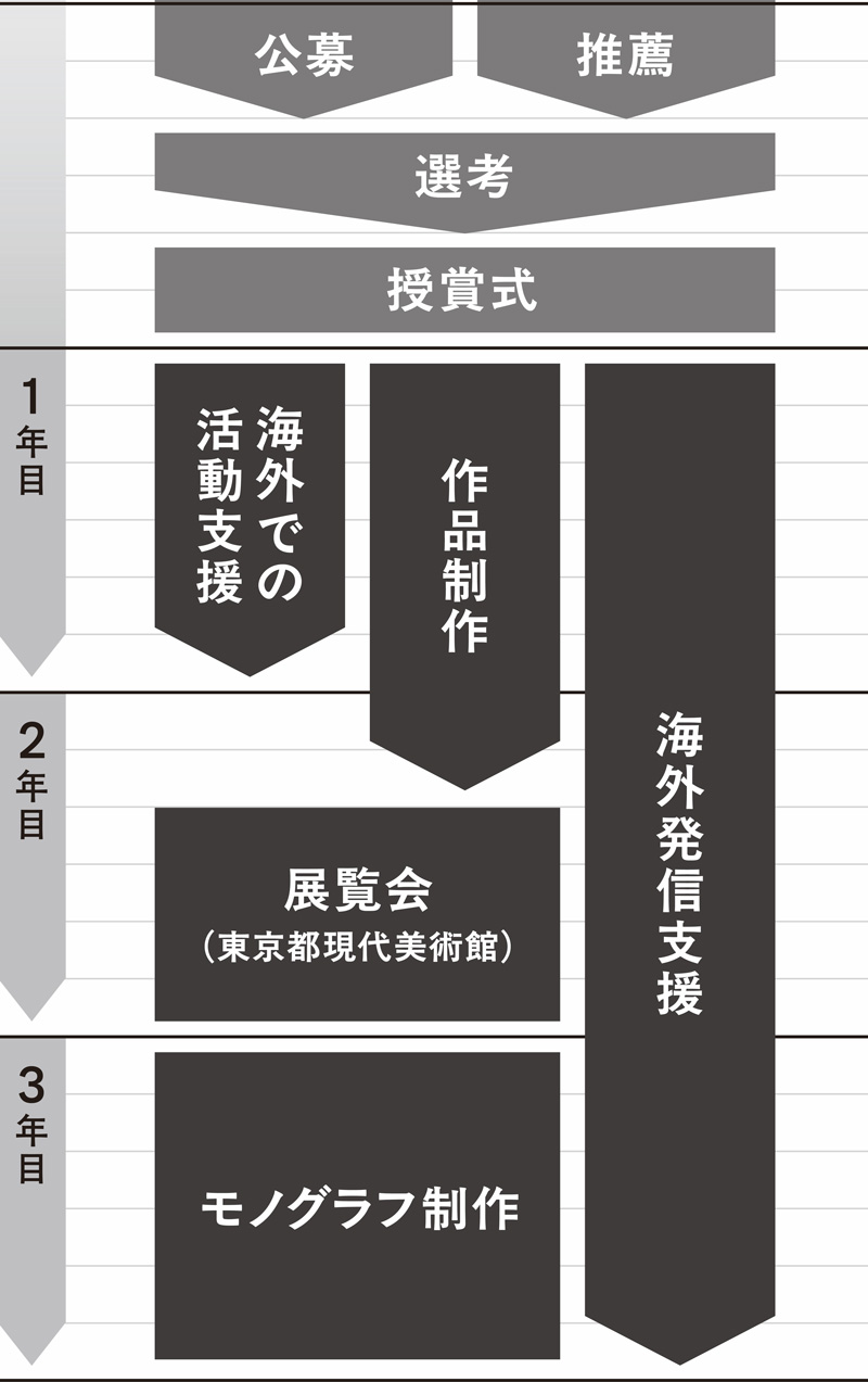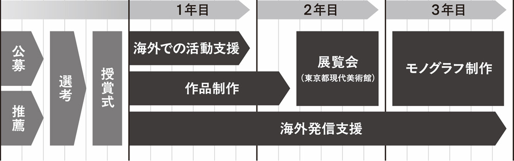 アーティストのキャリアにとって最適な時期に最善の支援内容を提供する必要性を重視する本賞の選考は、公募と推薦を併用し、選考委員によるリサーチや書類選考、スタジオ訪問などを経て2組の受賞者を決定。受賞者には複数年に渡る継続的な活動支援を行います。